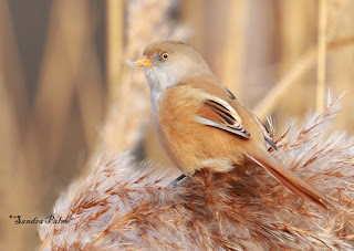 This was a unique opportunity to learn about typical bearded reedling behaviour...how they call to each other, how they feed, how they fly down to the bottom of the reeds regularly to drink (the seeds are very dry) and to eat grit (needed for digestion). And all of this only about a couple of metres away!